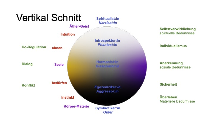 • Vertikal spannt sich eine Achse von unten nach oben auf: von triebhaft‑instinktiven, materiell gebundenen Kräften (Schwarz) hin zu geistig‑spirituellen, sinn- und bewusstseinsbezogenen Qualitäten (Weiss).
